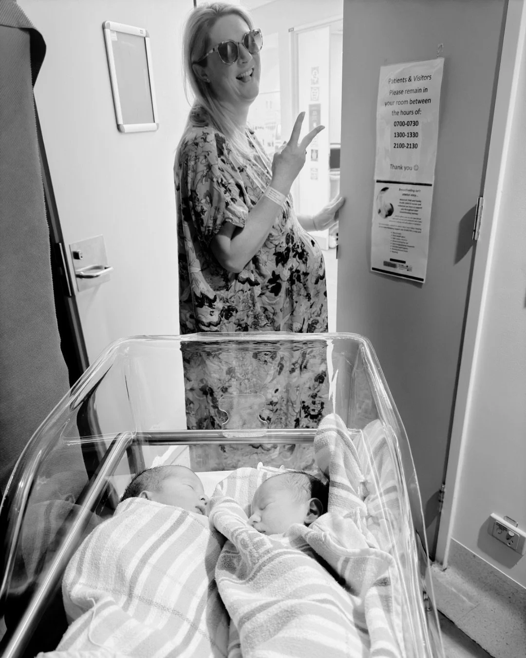 We arrived at the hospital where we were met by two hospital midwives and Amanda with a wide seat wheelchair. I have no idea how I got out of the car but I knelt on the wheelchair as I could feel baby’s head right there basically being held in by my underwear. Andrew wheeled the chair and one midwife held my perineum/baby’s head as we ran through to the “twin birthing room”. Once we got into the room the midwife cut my underwear off and baby one flew out, I didn’t even have time to take my sunglasses off!